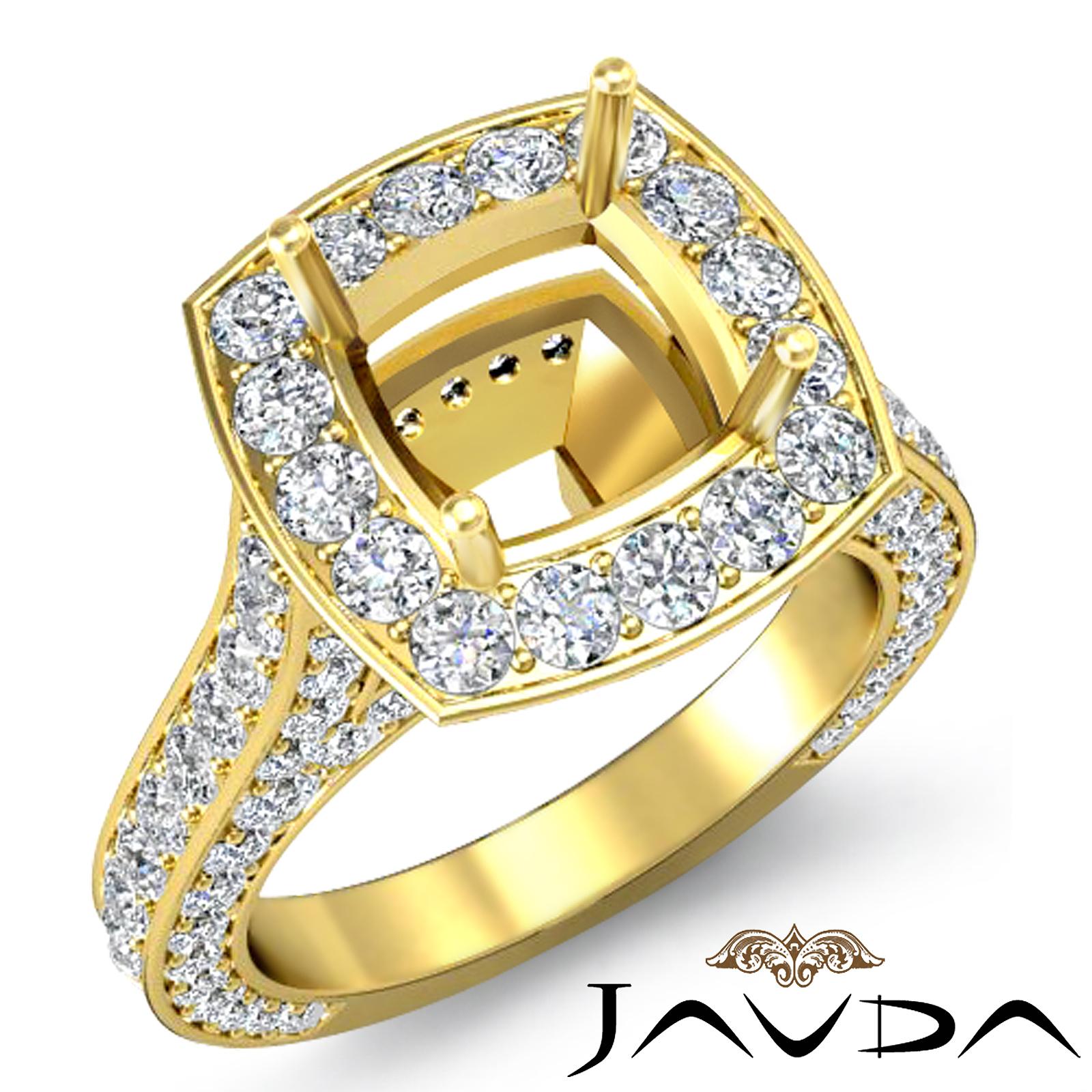 Lavishly romantic, this diamond engagement ring is made in glorious 14k Gold Yellow. This cushion semi mount ring features round pave diamonds in halo & along the gorgeous shank. (2.1Ct. tw.)