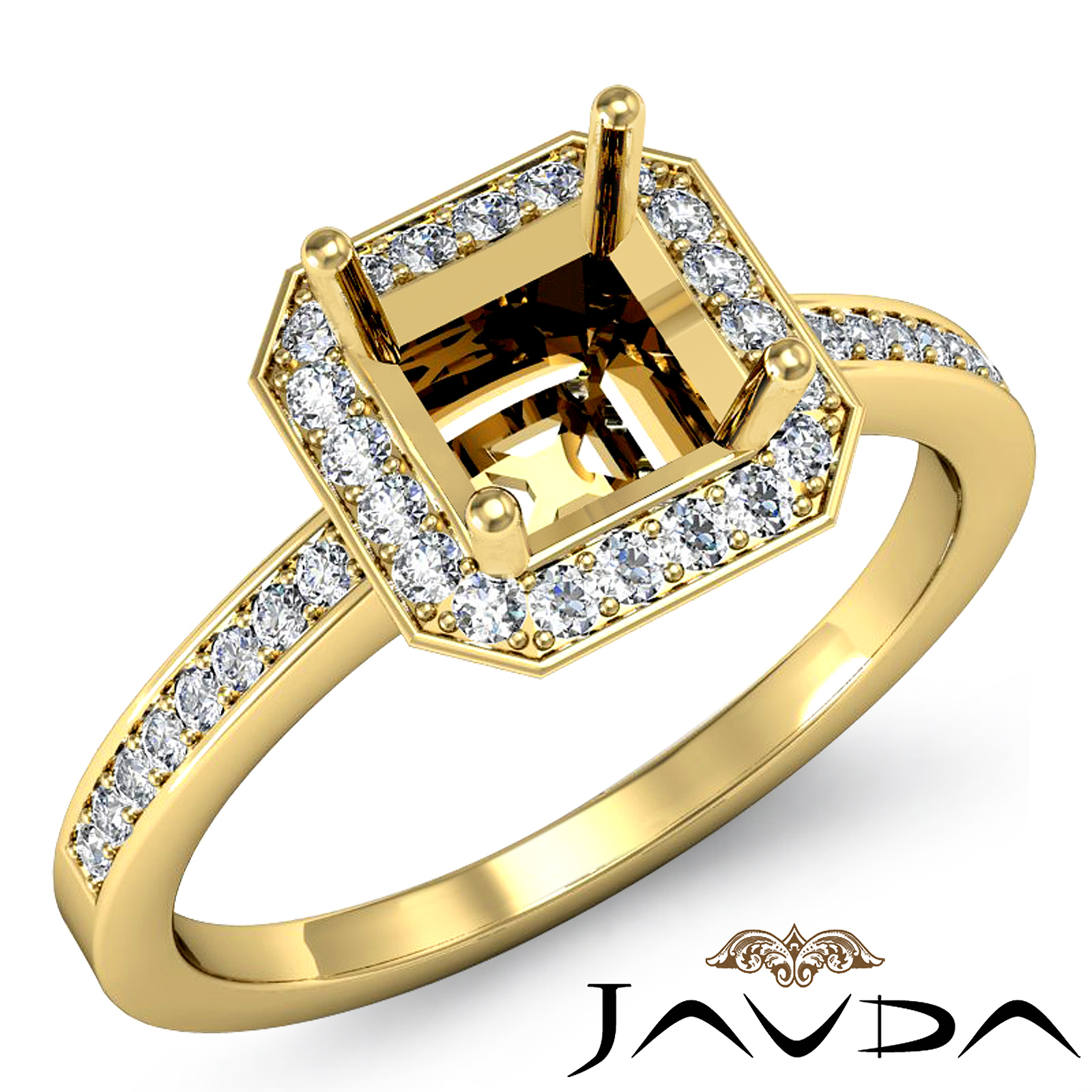 Elegant in its simplicity, this classic yet striking diamond engagement ring with an asscher semi mount is made in 18k Gold Yellow. It features round diamonds in pave setting in halo & on the shank. (1Ct. tw.)