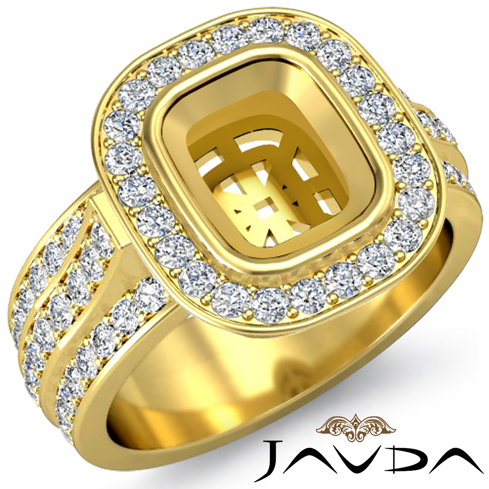 Made with love this 14k Gold Yellow diamond engagement ring is ready to set high standards. It features a cushion semi mount, with round pave diamonds on halo & the beautiful shank. (1.65Ct. tw.)