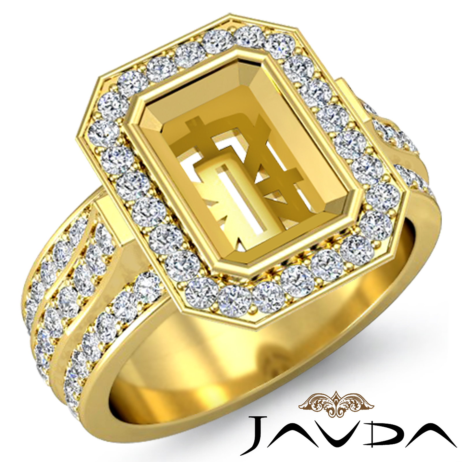Undeniably striking, this emerald semi mount diamond engagement ring is made in 18k Gold Yellow. It showcases round diamonds in halo & along the shank. (1.65Ct. tw.)