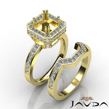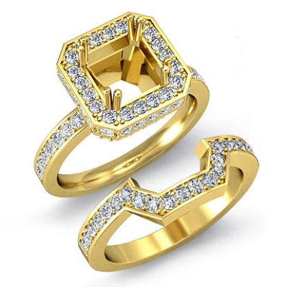 Declare your love, with this bridal set made in 18k Gold Yellow. The princess semi mount engagement ring and matching band feature round pave set diamonds on halo and along the shank looking gorgeous! (1.6Ct. tw.)