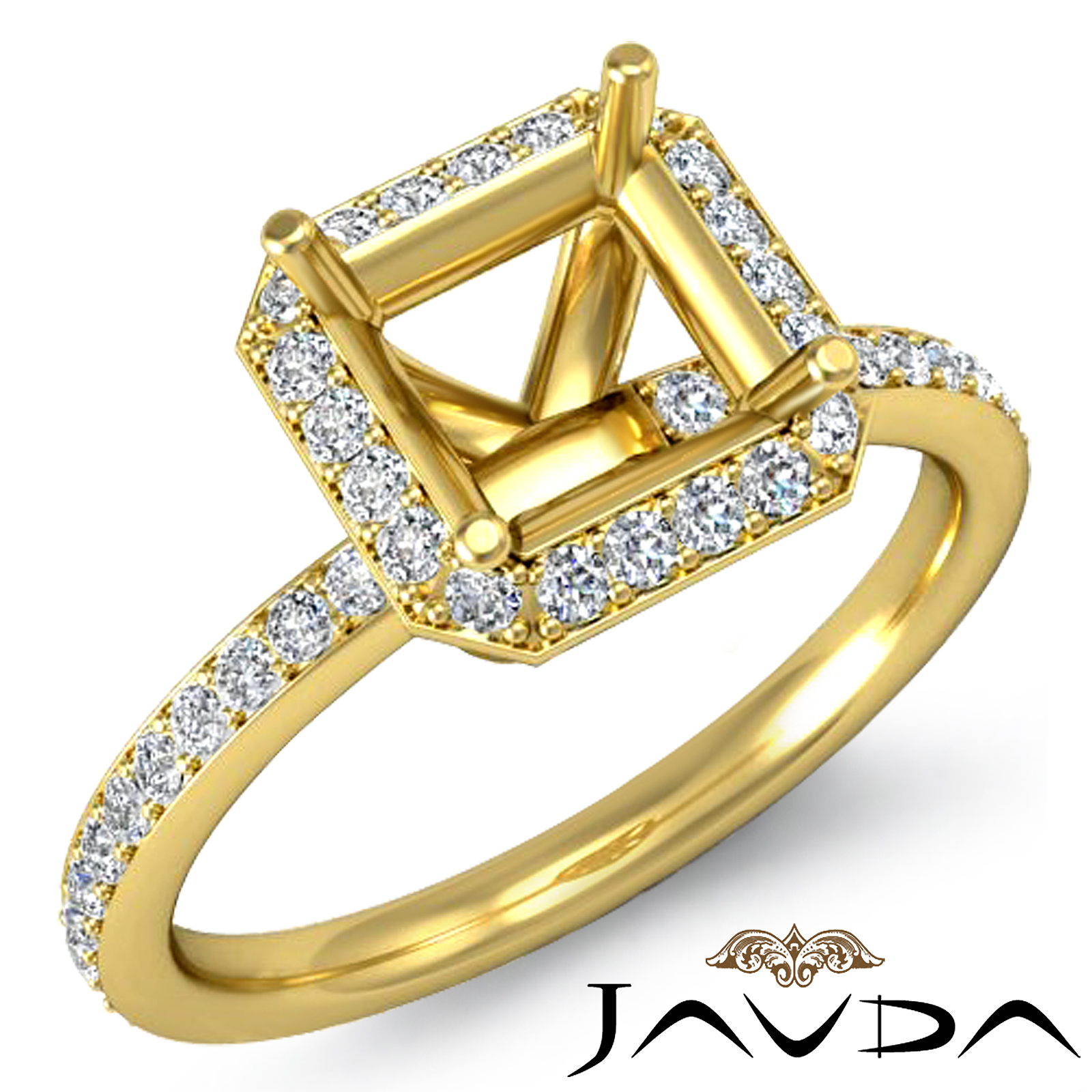 An elegant statement, this asscher diamond semi mount engagement ring captures all the romance, with pave set round diamonds in halo & on the shank. This ring is made in glorious 18k Gold Yellow (1Ct. tw.)