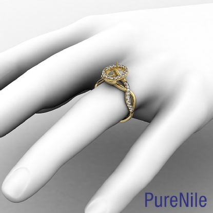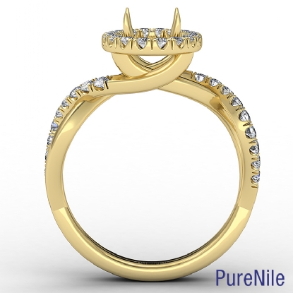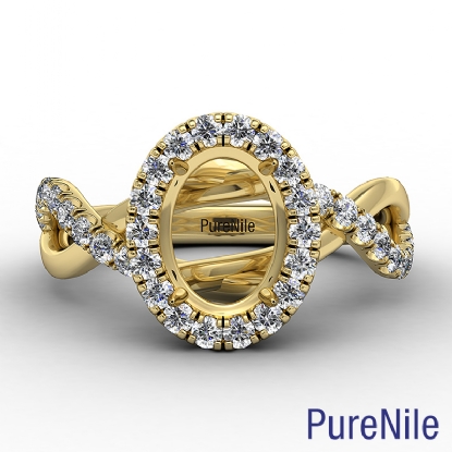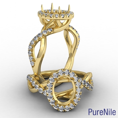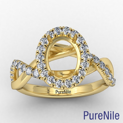 Women's oval diamond engagement ring crafted in 18k Gold Yellow. This halo diamond ring features criss cross shank and oval cut semi mount with side diamonds in a U split prong setting. Available in white gold, yellow gold, rose gold and platinum. (0.5Ct. tw.)