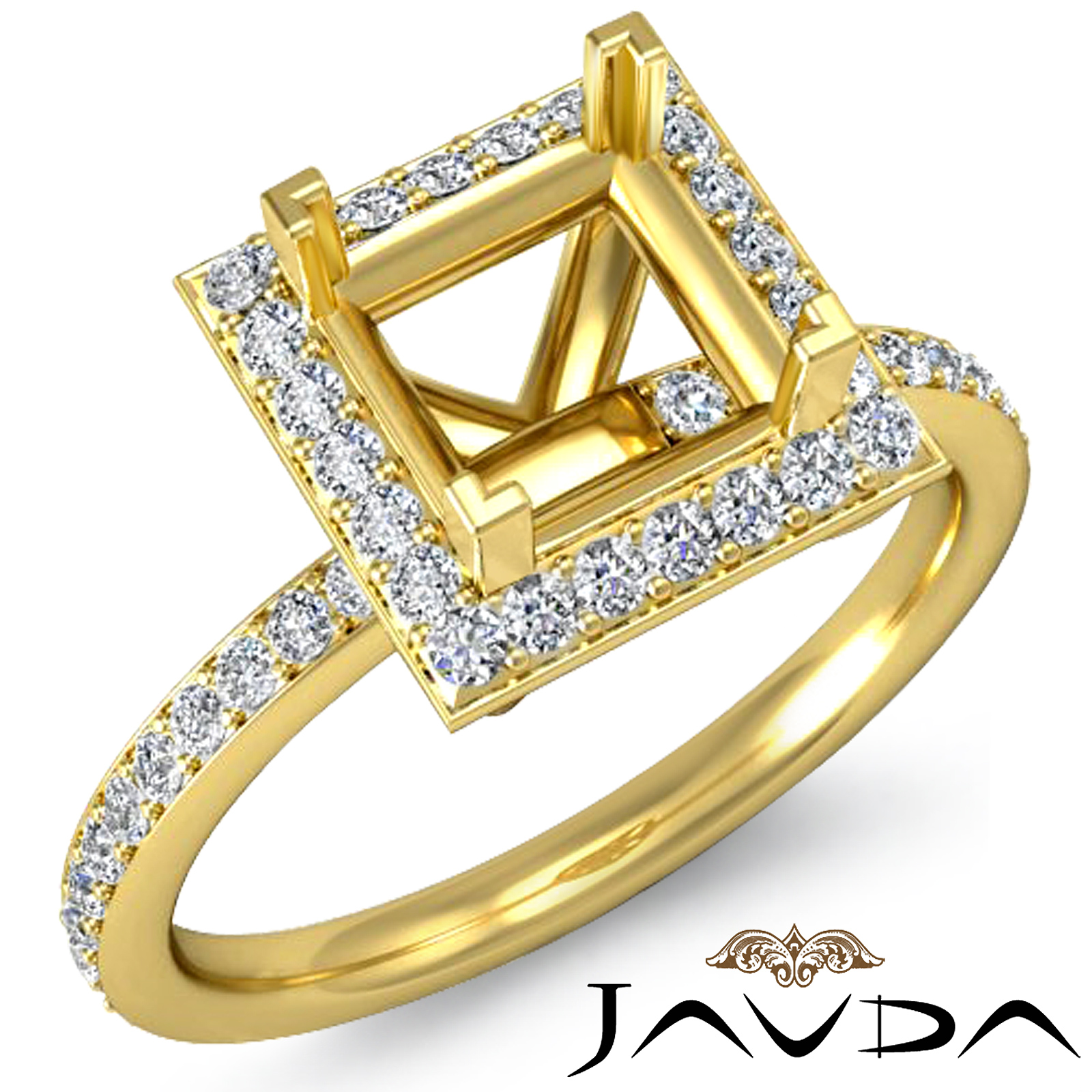 Unapologetically modern, this 18k Gold Yellow diamond engagement ring showcases a princess semi mount. of round pave diamonds dazzle along the halo & the shank. (1Ct. tw.)