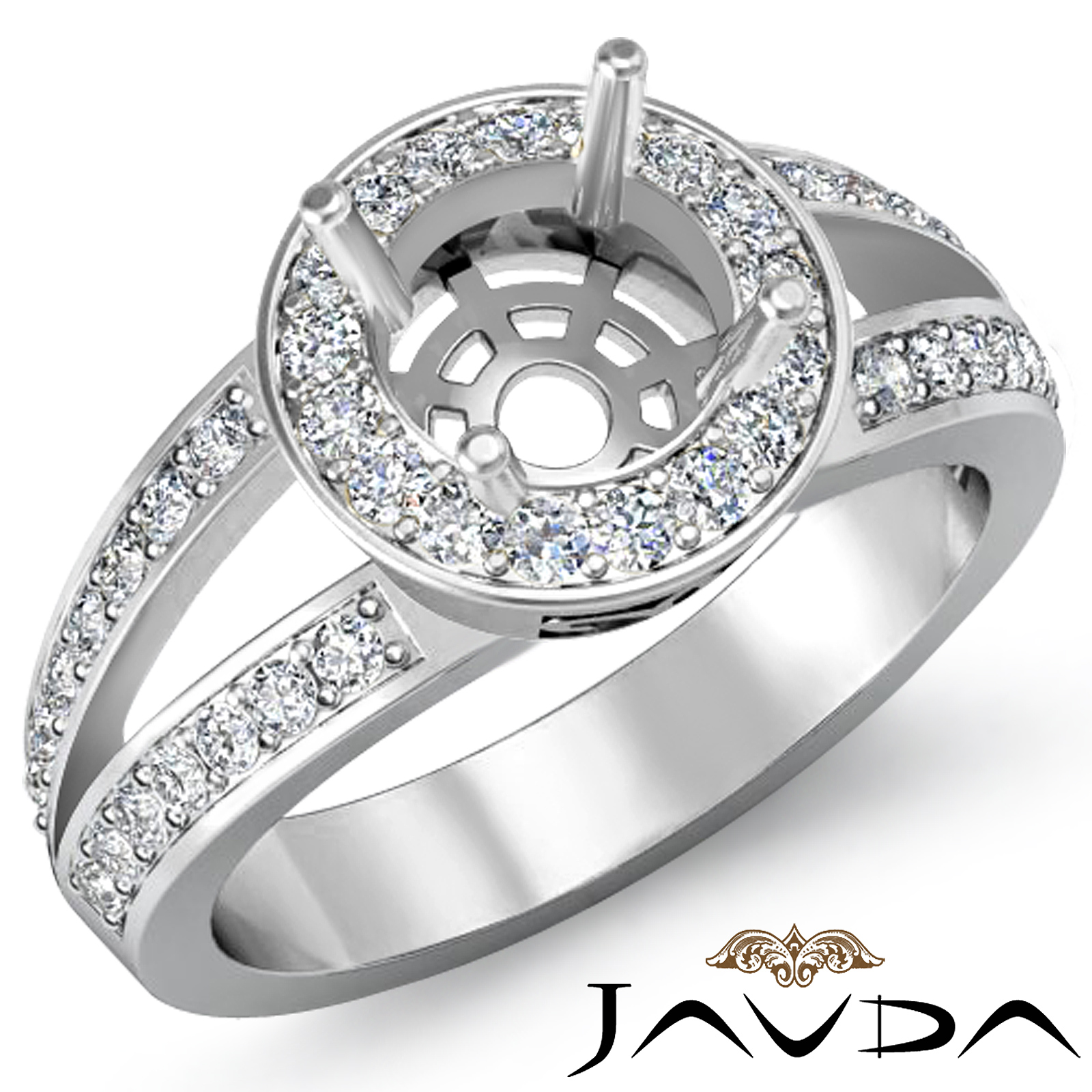 Lavishly romantic, this diamond engagement ring is made in glorious Platinum 950. This round semi mount ring features round diamonds in pave setting on the halo & shank. (0.55Ct. tw.)