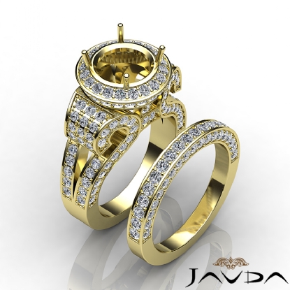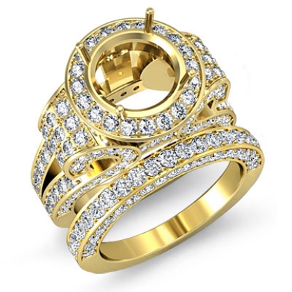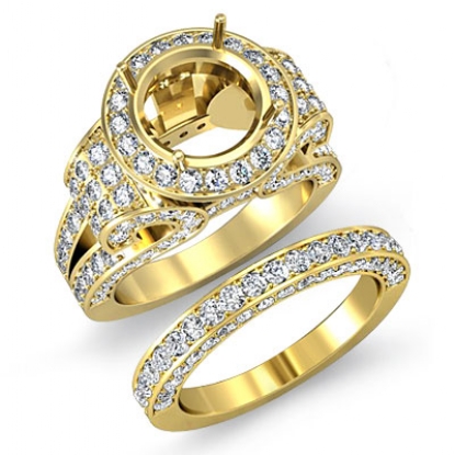This antique Women's diamond engagement ring and matching band, showcases a round semi-mount halo and a royal shank of round pave-set diamonds. This bridal set is made in enduring 18k Gold Yellow. (3.7Ct. tw.)