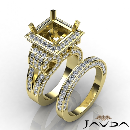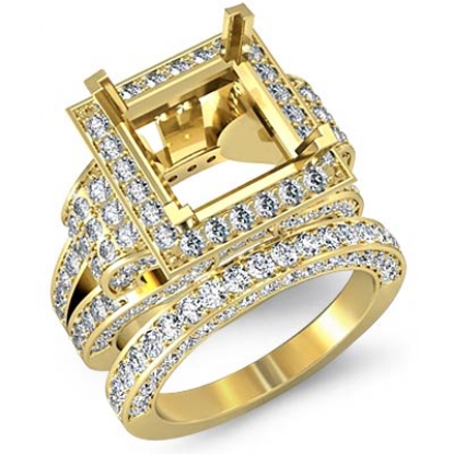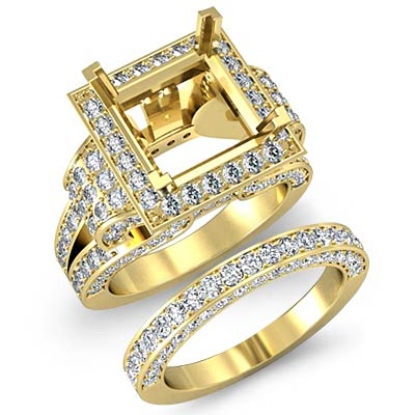 Vintage in design, this Women's diamond engagement ring and matching band, showcases a princess semi-mount halo and a royal shank of round pave-set diamonds. This bridal set is made in enduring 14k Gold Yellow. (3.4Ct. tw.)