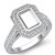 This strikingly sophisticated 18k Gold White engagement ring showcases an emerald semi mount. It displays round pave diamonds in halo & along the shank. (1.65Ct. tw.)