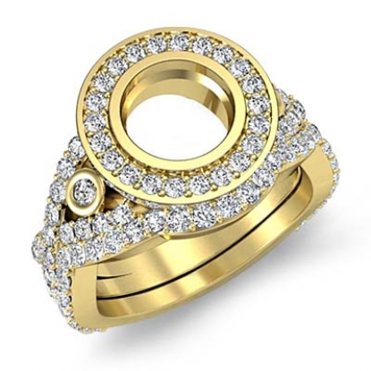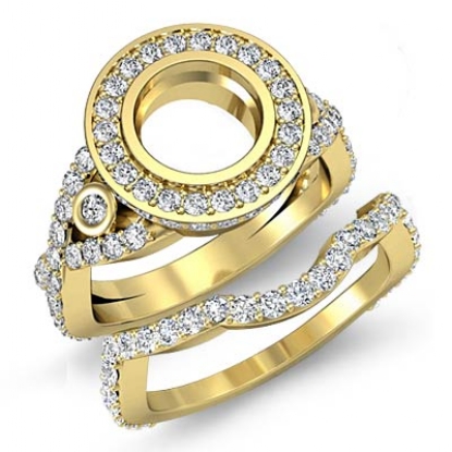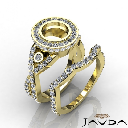 Gorgeous in design, this 14k Gold Yellow bridal set weighs The round semi mount engagement ring and matching band feature pave set round diamonds in halo and criss cross shank looking fabulous! (2.1Ct. tw.)