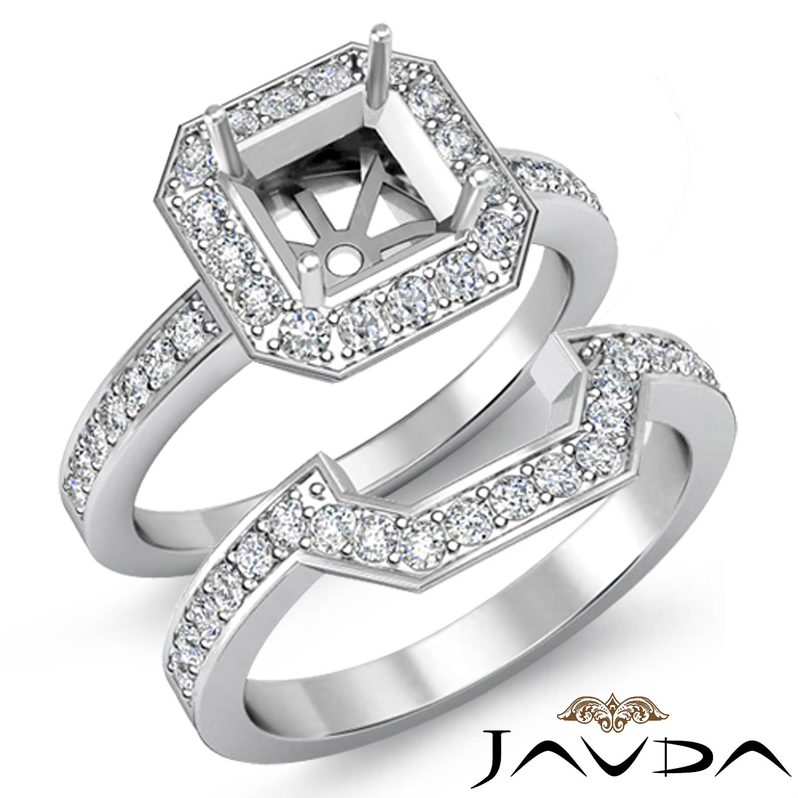 This asscher semi mount engagement ring and matching band feature round pave set diamonds in halo and along the shank. Made in Platinum 950, this bridal set is truly extraordinary! (1.4Ct. tw.)