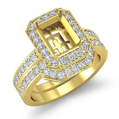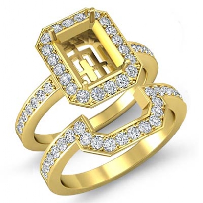 This emerald semi mount engagement ring and matching band feature round pave set diamonds in halo and along the shank. Made in 14k Gold Yellow, this bridal set is mesmerising! (1.4Ct. tw.)