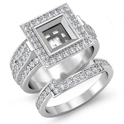 Sparkling! This princess semi mount engagement ring and women's wedding band features round pave set diamonds in halo and along the pretty shank. This bridal set is made in enduring 18k Gold White. (2.3Ct. tw.)