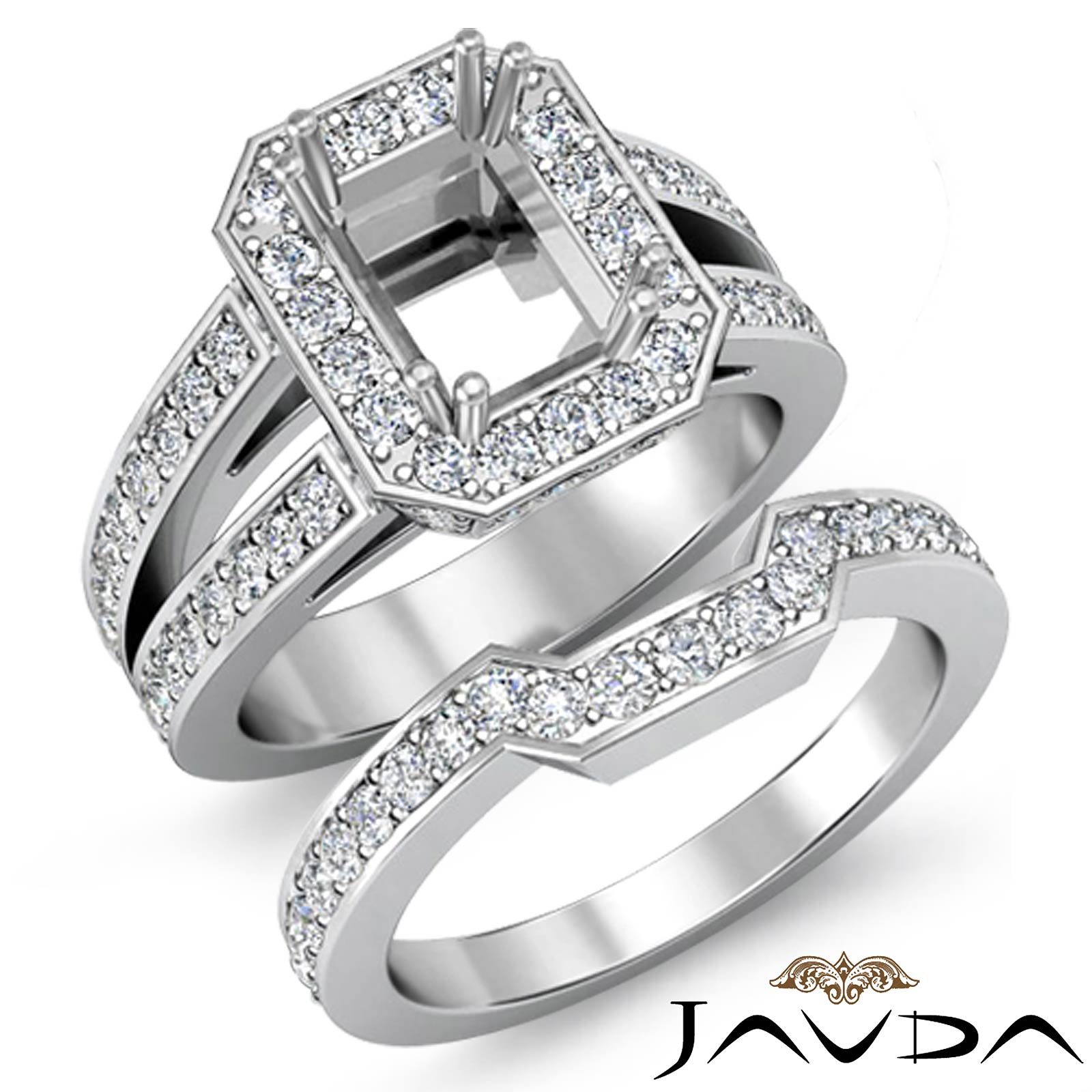 Magnificent in design, this Radiant semi mount engagement ring comes with a gorgeous matching band. It features round pave set diamonds in halo and on the split shank. This bridal set is made in Platinum 950. (2Ct. tw.)