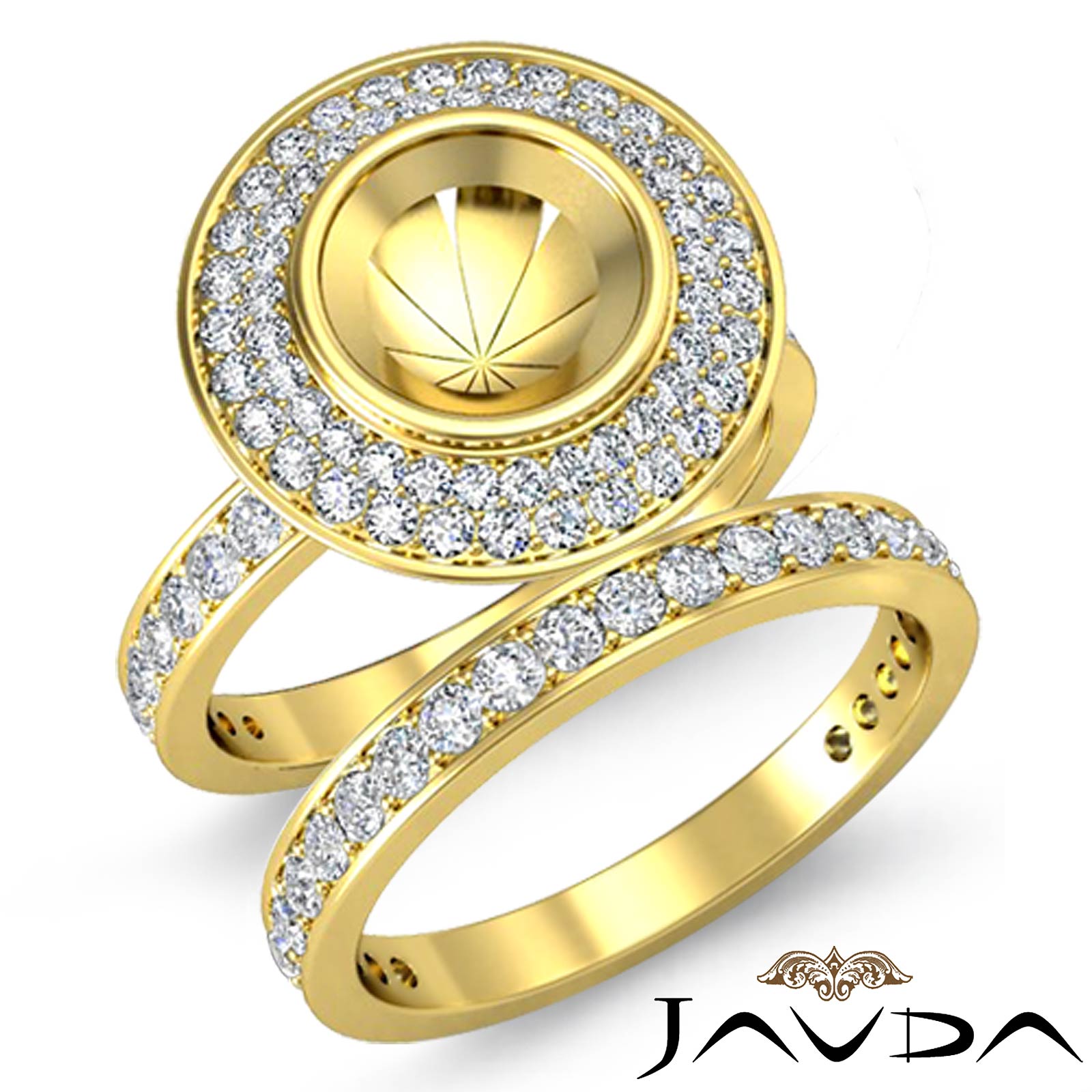 Intricately designed, this round semi mount engagement ring and wedding band features round pave set diamonds in a two layer halo and along the shank. Made in 18k Gold Yellow, this bridal set is truly beautiful. (1.28Ct. tw.)