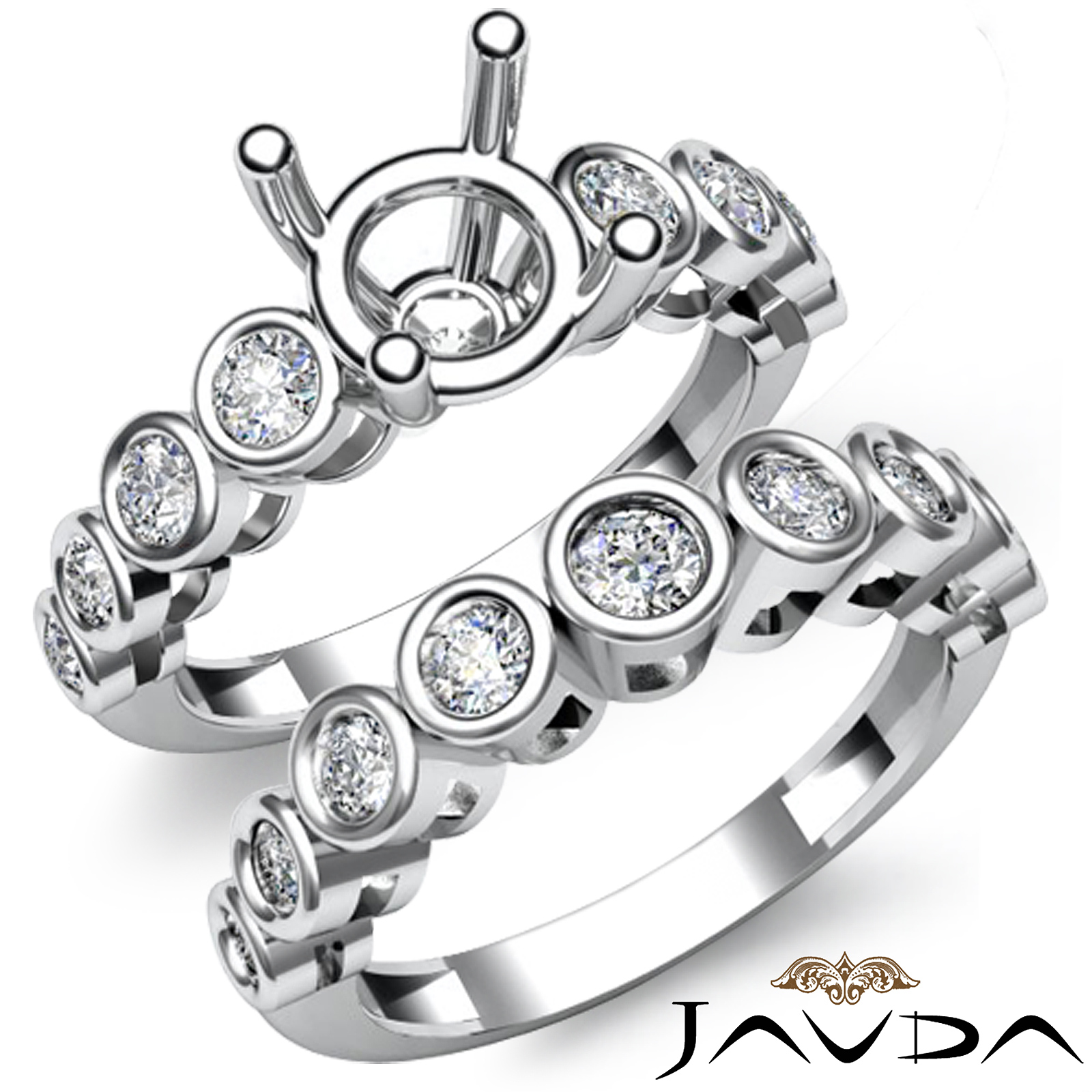 round diamond semi mount engagement ring with matching band, complete this bridal set which is made in enduring 18k Gold White. Bezel set round diamonds add to the beauty of this bridal set. (0.86Ct. tw.)