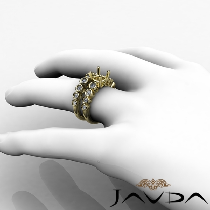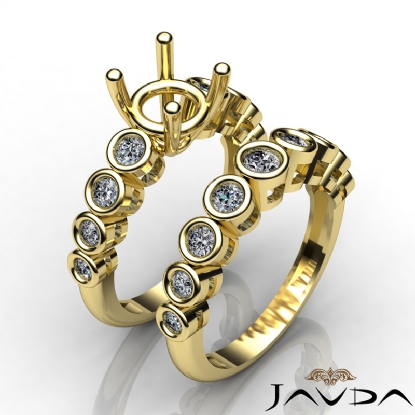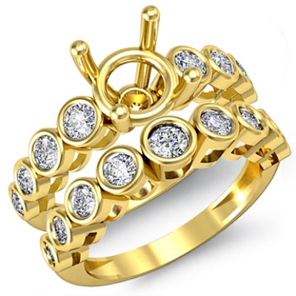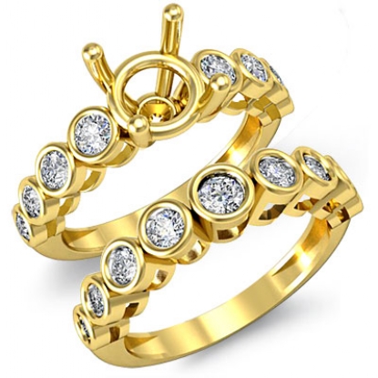 round diamond semi mount engagement ring with matching band, complete this bridal set which is made in enduring 18k Gold Yellow. Bezel set round diamonds add to the beauty of this bridal set. (0.86Ct. tw.)