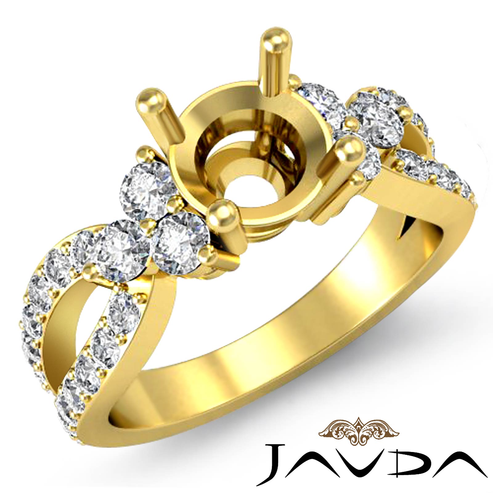 A wreath of diamonds surrounds the semi mount center stone, with round diamonds in prong setting along the sides. The pave set diamonds in split shank add to the ring's beauty. This engagement ring is made in 18k Gold Yellow. (0.86Ct. tw.)