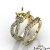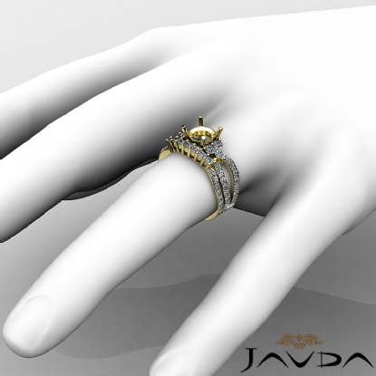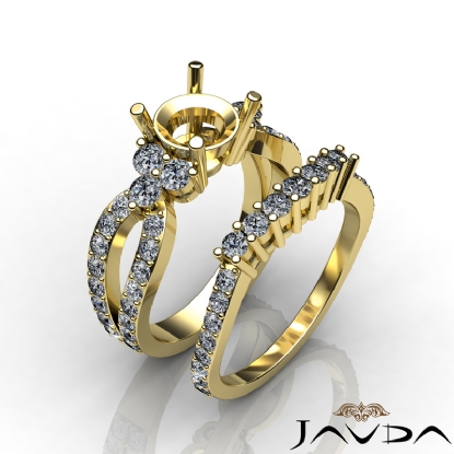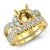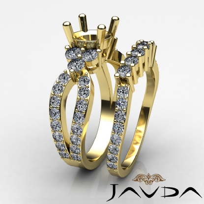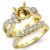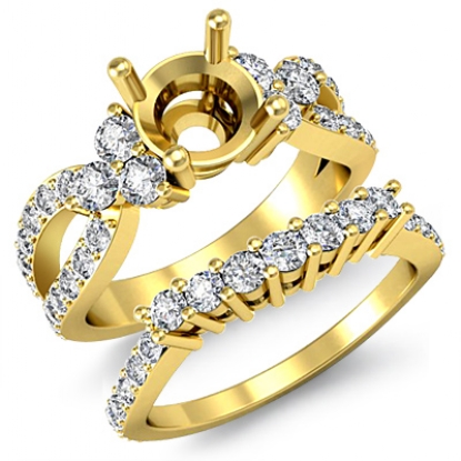 A wreath of diamonds surrounds the semi mount engagement ring, with round diamonds in prong setting on the sides. The round pave diamonds on the matching band look beautiful. This bridal set is made in 14k Gold Yellow. (1.55Ct. tw.)