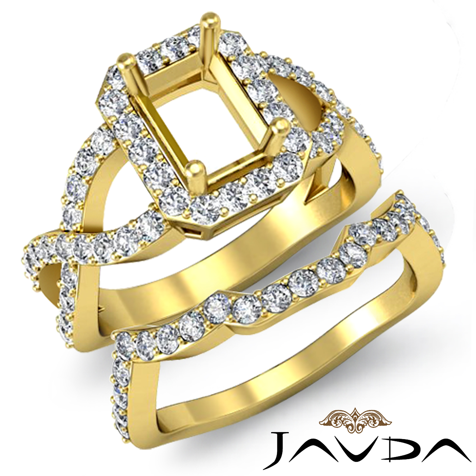 Tell her you love her with this 18k Gold Yellow semi mount bridal set showcasing a drape of pave set diamonds in halo and along the twisted shank. This engagement ring comes with a matching band. (1.2Ct. tw.)