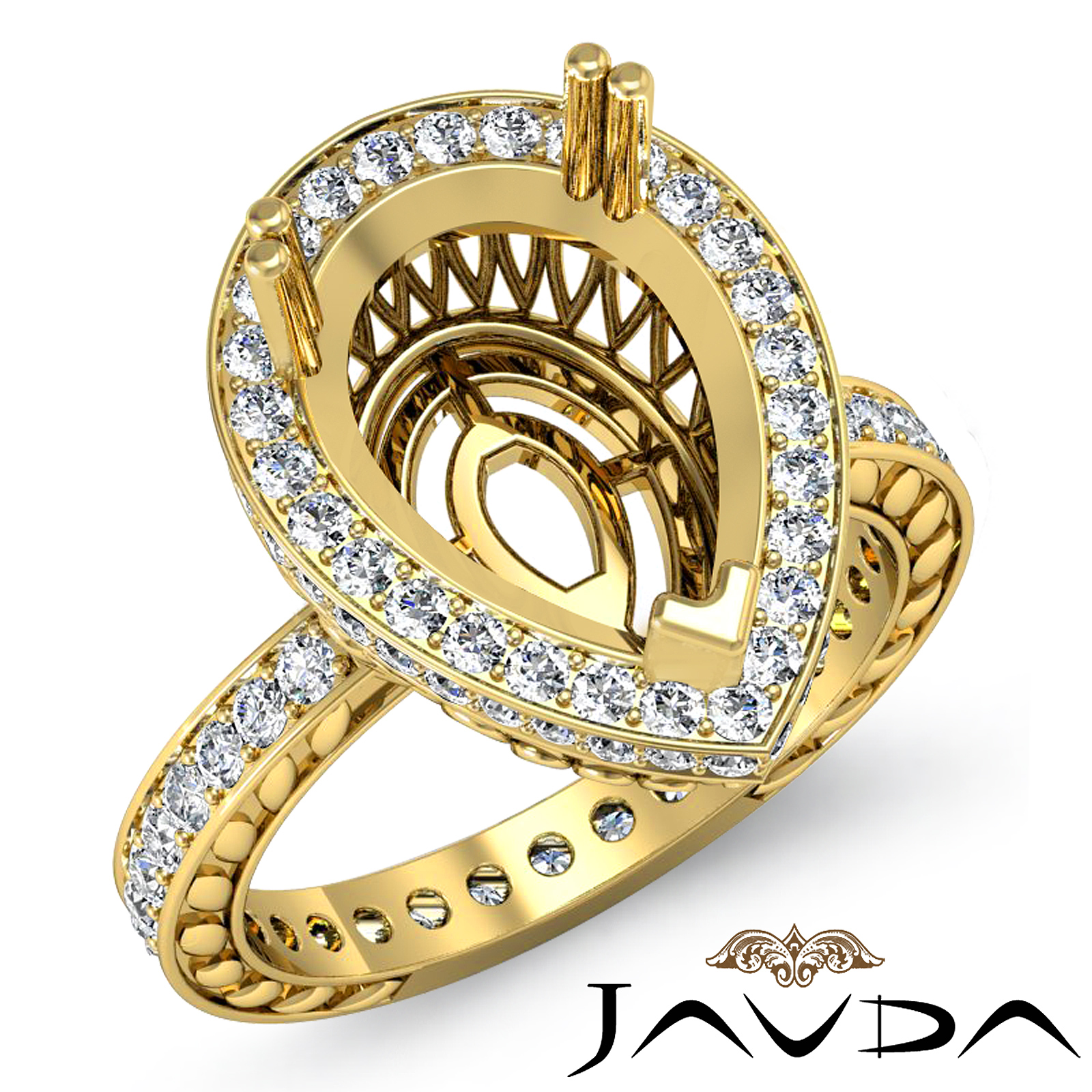 Round diamond engagement ring 14k Gold Yellow in polished finish with Pear shaped diamond semi mount in Halo pave setting. (1Ct. tw.)