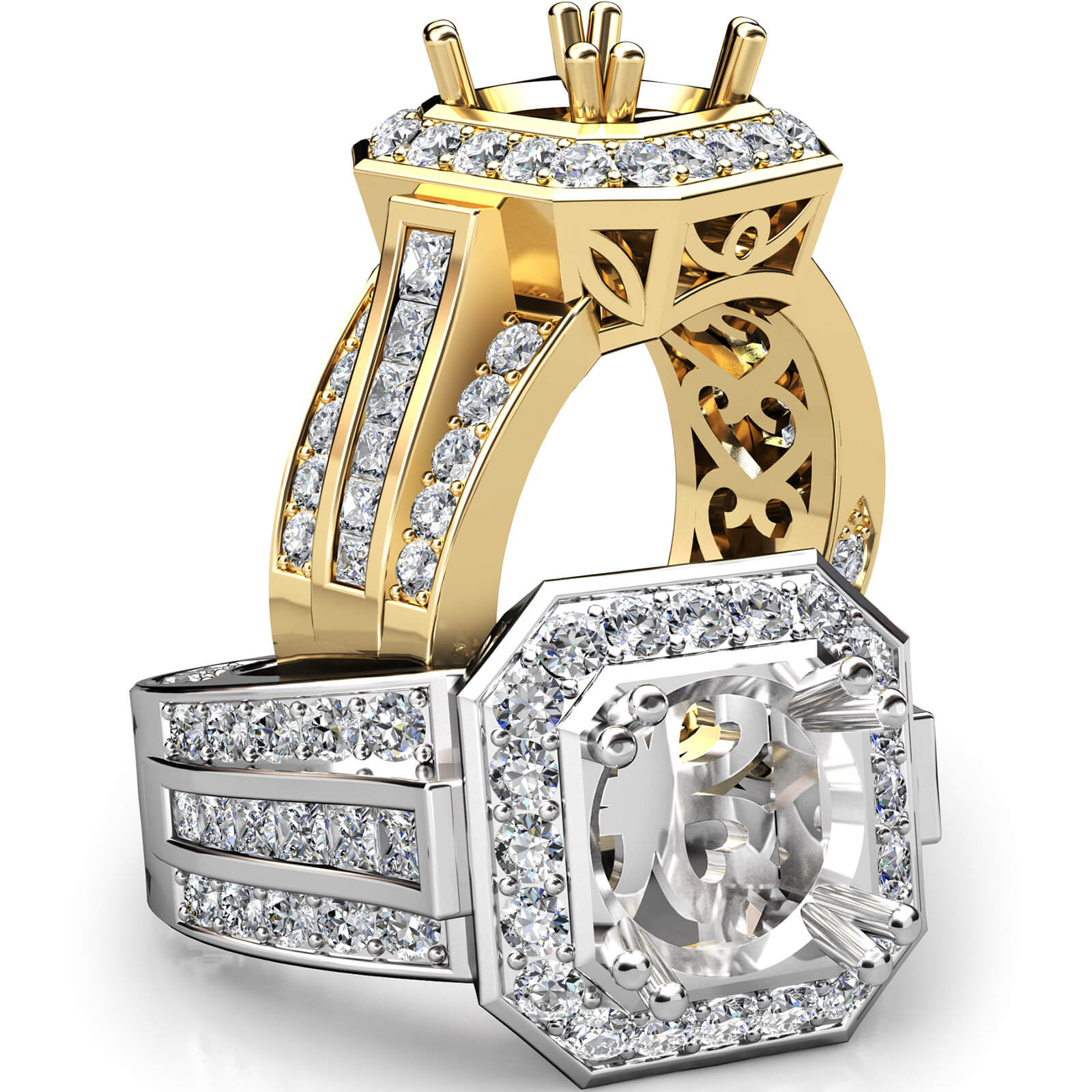 Made in 14k Gold Yellow & vintage in design, this women's diamond engagement ring showcases a semi-mount halo of round pave-set diamonds, along with princess diamonds in channel setting on the shank. (1.65Ct. tw.)