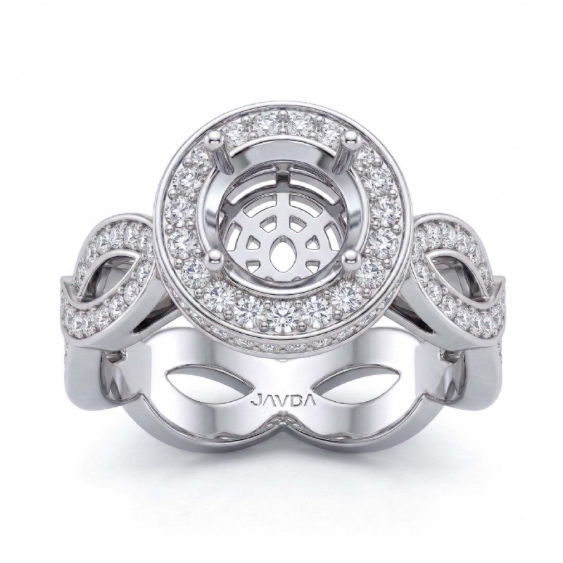 Undeniably striking, this Platinum 950 diamond engagement ring showcases a round semi mount in halo setting, with pave set round diamonds dazzling on the halo and the beautiful criss-cross shank. (1.3Ct. tw.)
