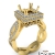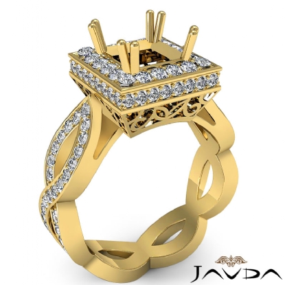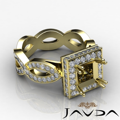 An elegant statement, this 14k Gold Yellow split-shank diamond semi mount engagement ring captures all the romance with pave set round diamonds in halo & along the criss-cross shank. (1.3Ct. tw.)