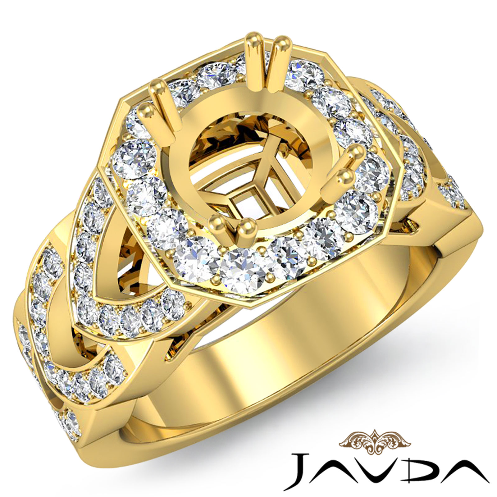Lavishly romantic, this diamond engagement ring is made in enduring 14k Gold Yellow. It features a round semi mount, with sparkling pave diamonds on halo and the gorgeous shank. (1.28Ct. tw.)