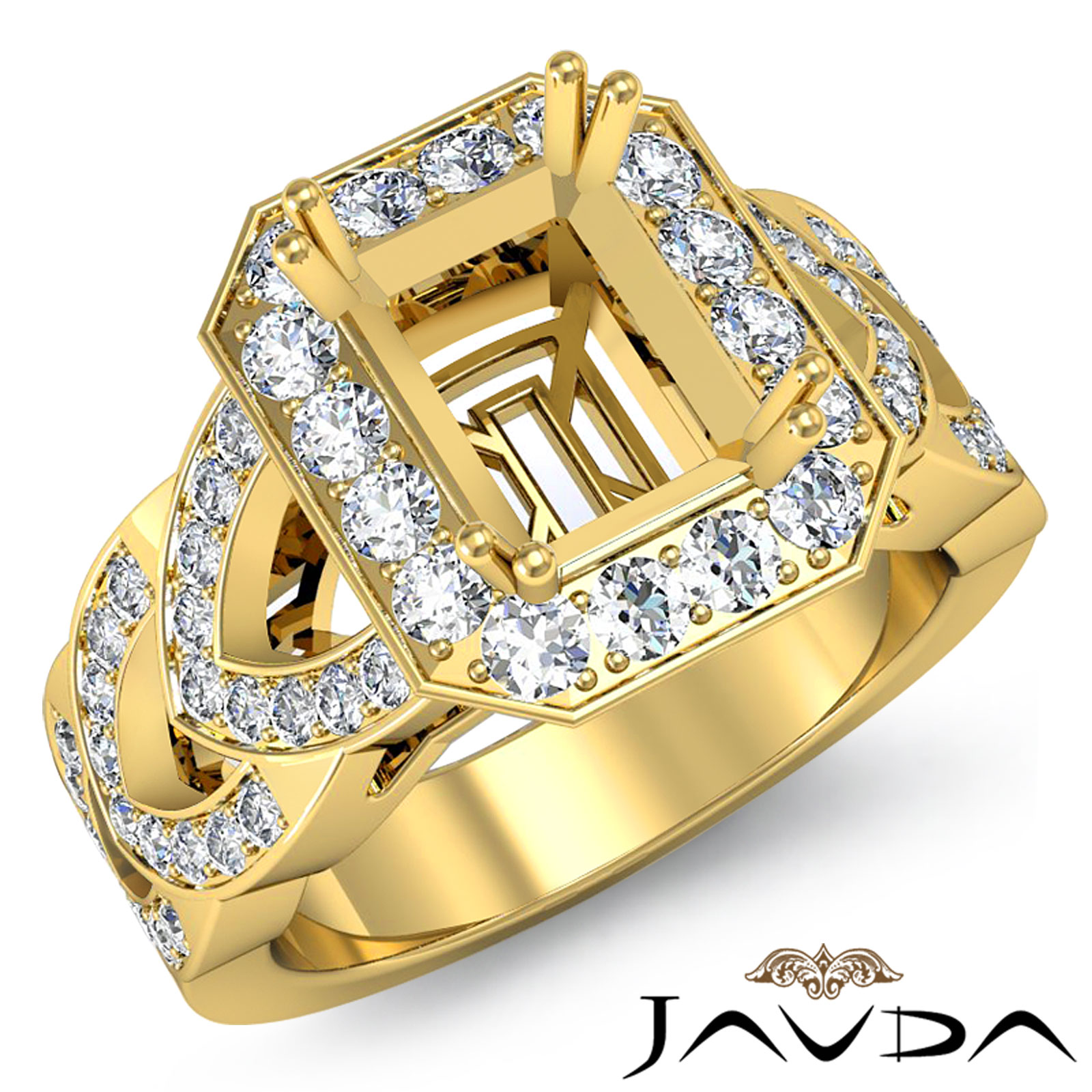 Undeniably striking, this emerald semi mount diamond engagement ring is made in 18k Gold Yellow. It features pave set round diamonds in halo & along the glorious shank. (1.27Ct. tw.)