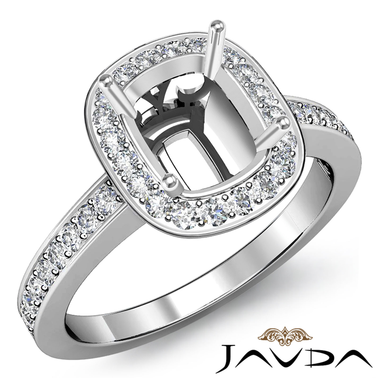 Get ready for glamour, with this striking diamond engagement ring made in 18k Gold White. The cushion semi mount ring features pave set round diamonds in halo & along the shank. (0.36Ct. tw.)