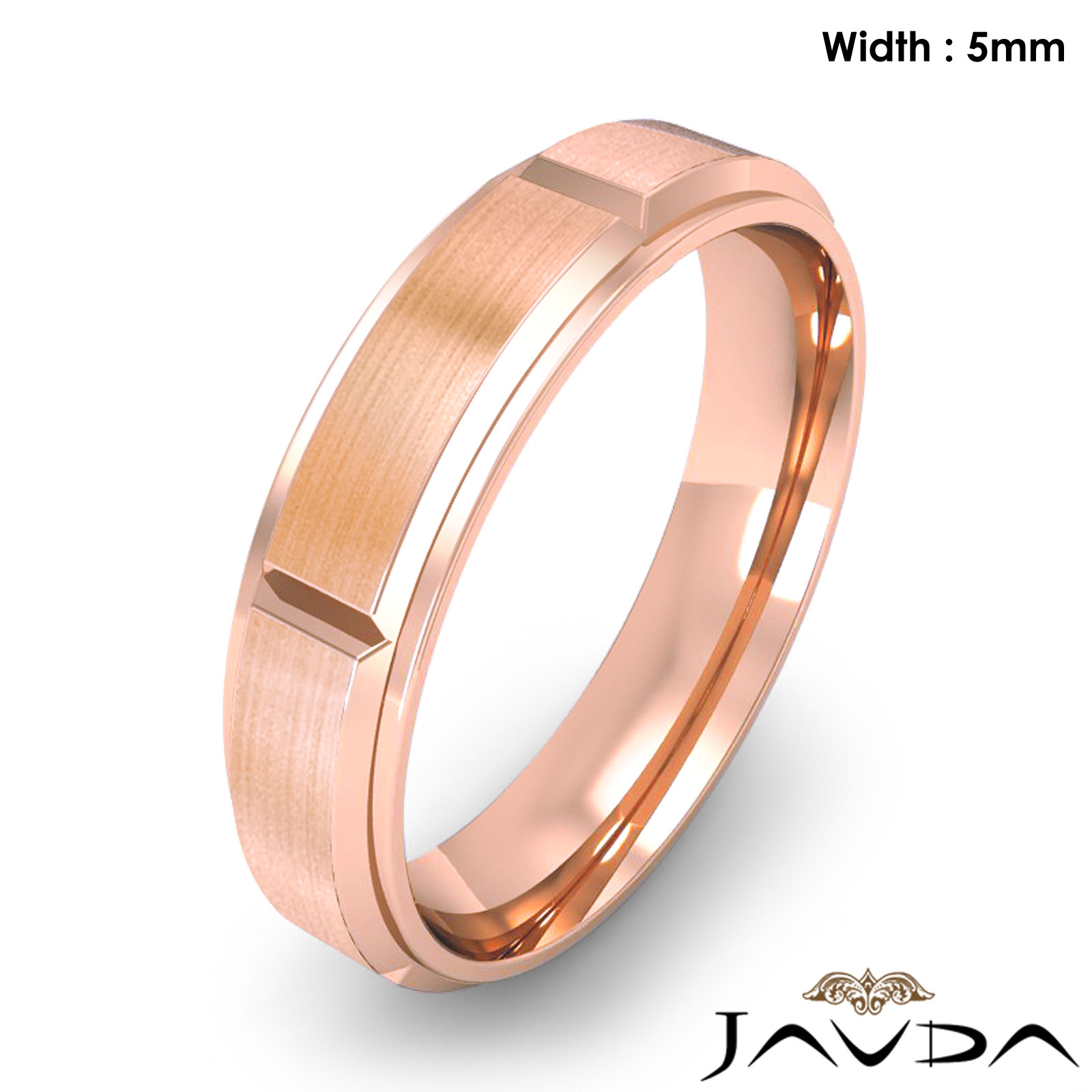 6 gram Men's 14k Rose Gold Solid Beveled Edge Wedding Band. Dome style band. Ring Size is 8". Width is 5mm. Available in high polish and matt finish.