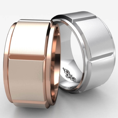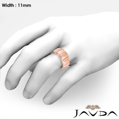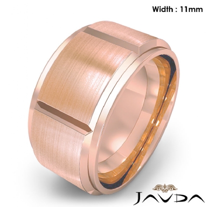 16.1 gram Men's 14k Rose Gold Solid Beveled Edge Wedding Band. Dome style band. Ring Size is 8". Width is 11mm. Available in high polish and matt finish.