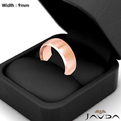 11.6 gram Men's 14k Rose Gold Solid Beveled Edge Wedding Band. Dome style band. Ring Size is 8". Width is 9mm. Available in high polish and matt finish.