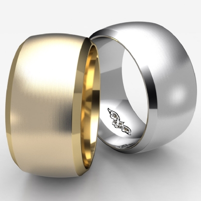 15.2 gram Men's 14k Gold White Solid Beveled Edge Wedding Band. Dome style band. Ring Size is 8". Width is 11mm. Available in high polish and matt finish.