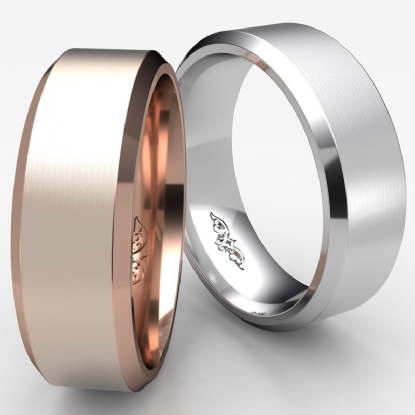 9.9 gram Men's 14k Rose Gold Solid Beveled Edge Wedding Band. Flat style band. Ring Size is 8". Width is 7mm. Available in high polish and matt finish.