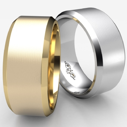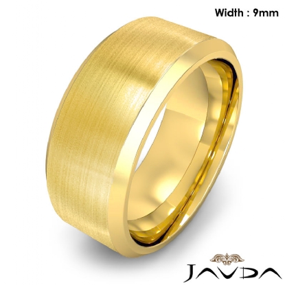15.7 gram Men's 18k Gold Yellow Solid Beveled Edge Wedding Band. Flat style band. Ring Size is 8". Width is 9mm. Available in high polish and matt finish.