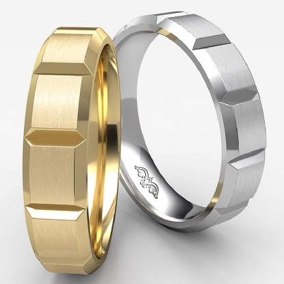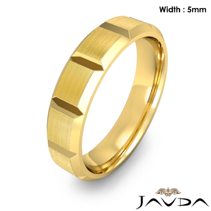 7.3 gram Men's 18k Gold Yellow Solid Beveled Edge Wedding Band. Dome style Traditional band. Ring Size is 8". Width is 5mm. Available in high polish and matt finish.