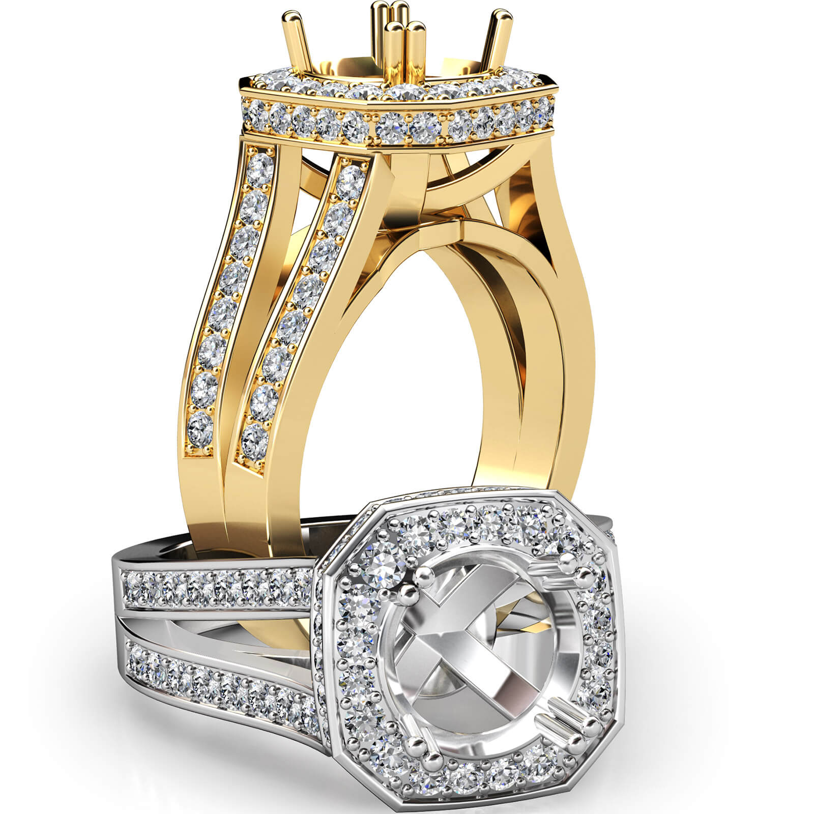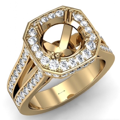Undeniably striking, this round semi mount ring is made in 18k Gold Yellow. The diamond engagement ring features pave set round diamonds in halo & along the sparkling shank. (1.34Ct. tw.)