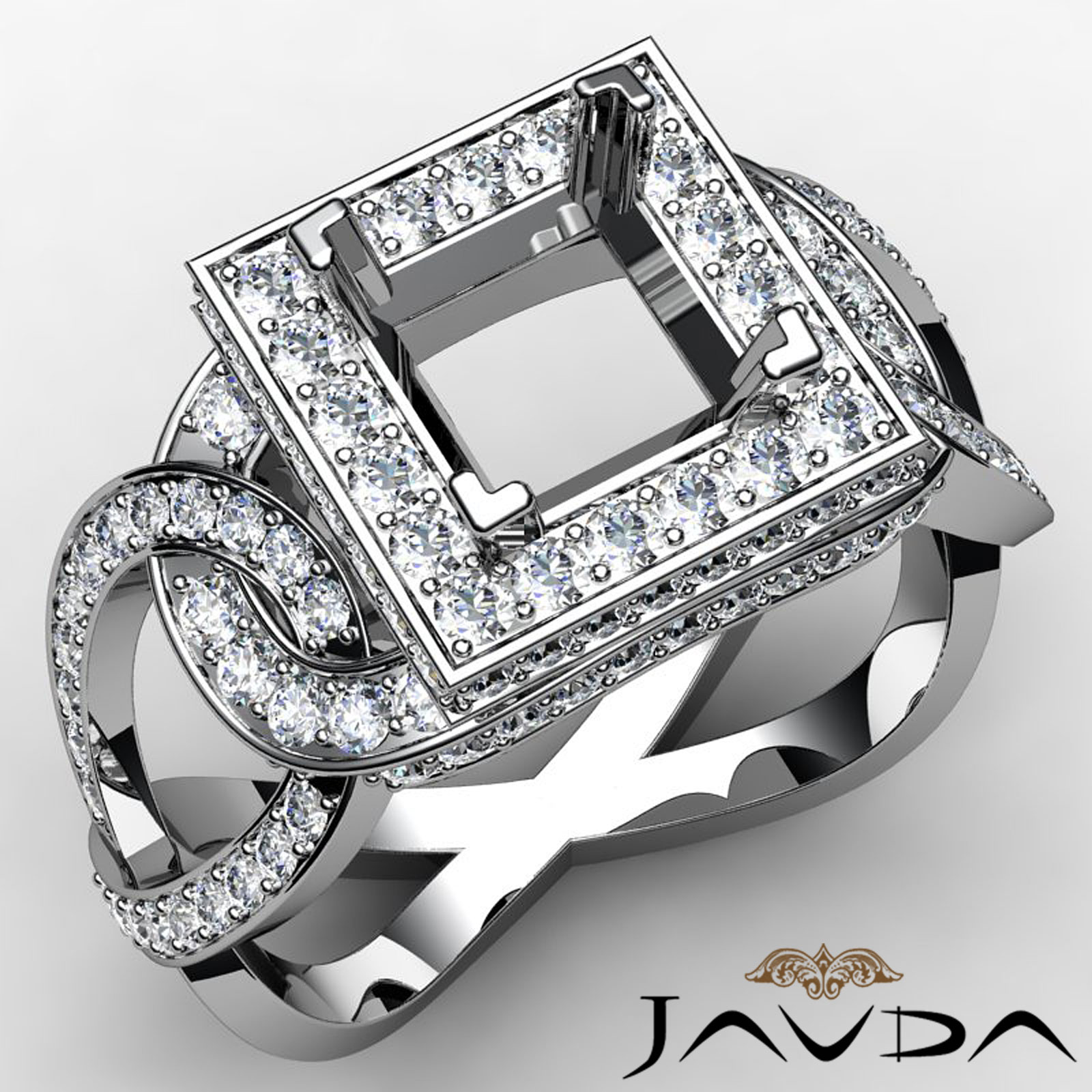 Diamond Engagement Princess Semi Mount Halo Pave Set Ring 18k W Gold (1.25Ct. tw.)