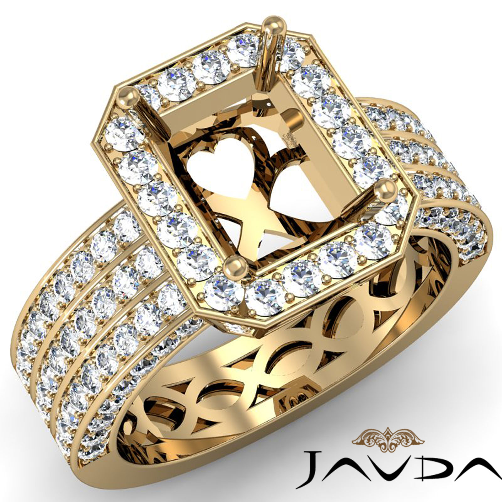 Emerald Semi Mount 3 Row Diamond Engagement Ring 18k Gold Halo Set (1.38Ct. tw.)