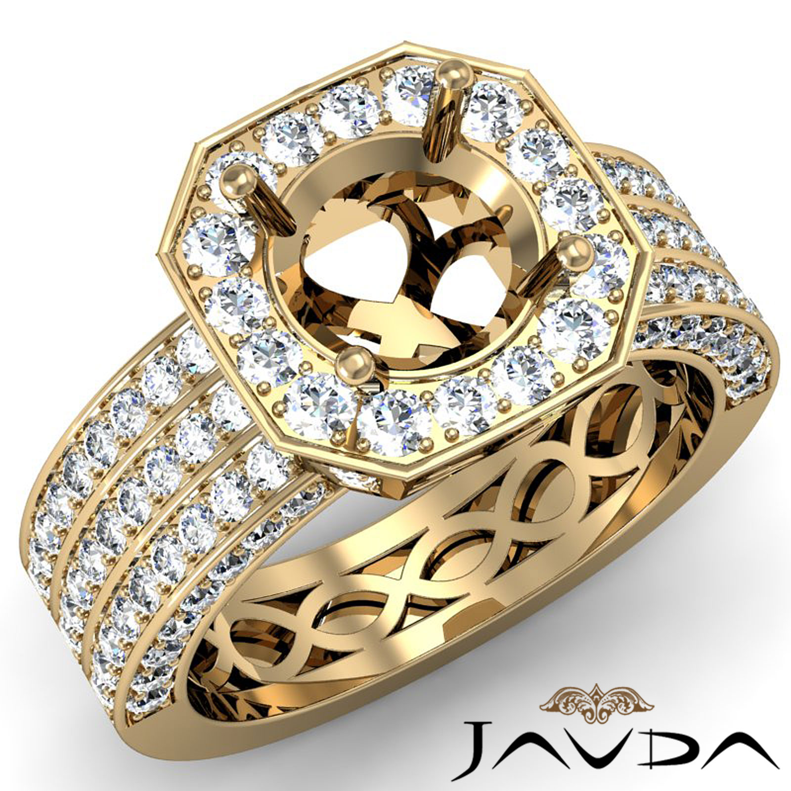 Graceful in design, this classic yet distinctive semi mount engagement ring is made in alluring 14k Gold Yellow. It features a round semi mount with pave set round diamonds in halo & along the magnificent shank. (1.47Ct. tw.)
