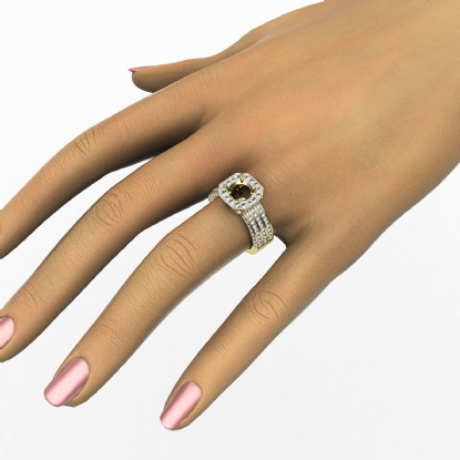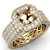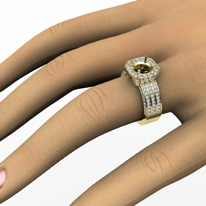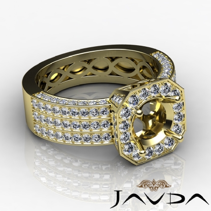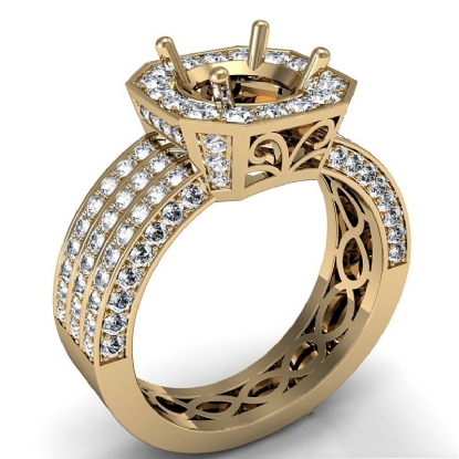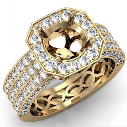 Graceful in design, this classic yet distinctive semi mount engagement ring is made in alluring 18k Gold Yellow. It features a round semi mount with pave set round diamonds in halo & along the magnificent shank. (1.47Ct. tw.)