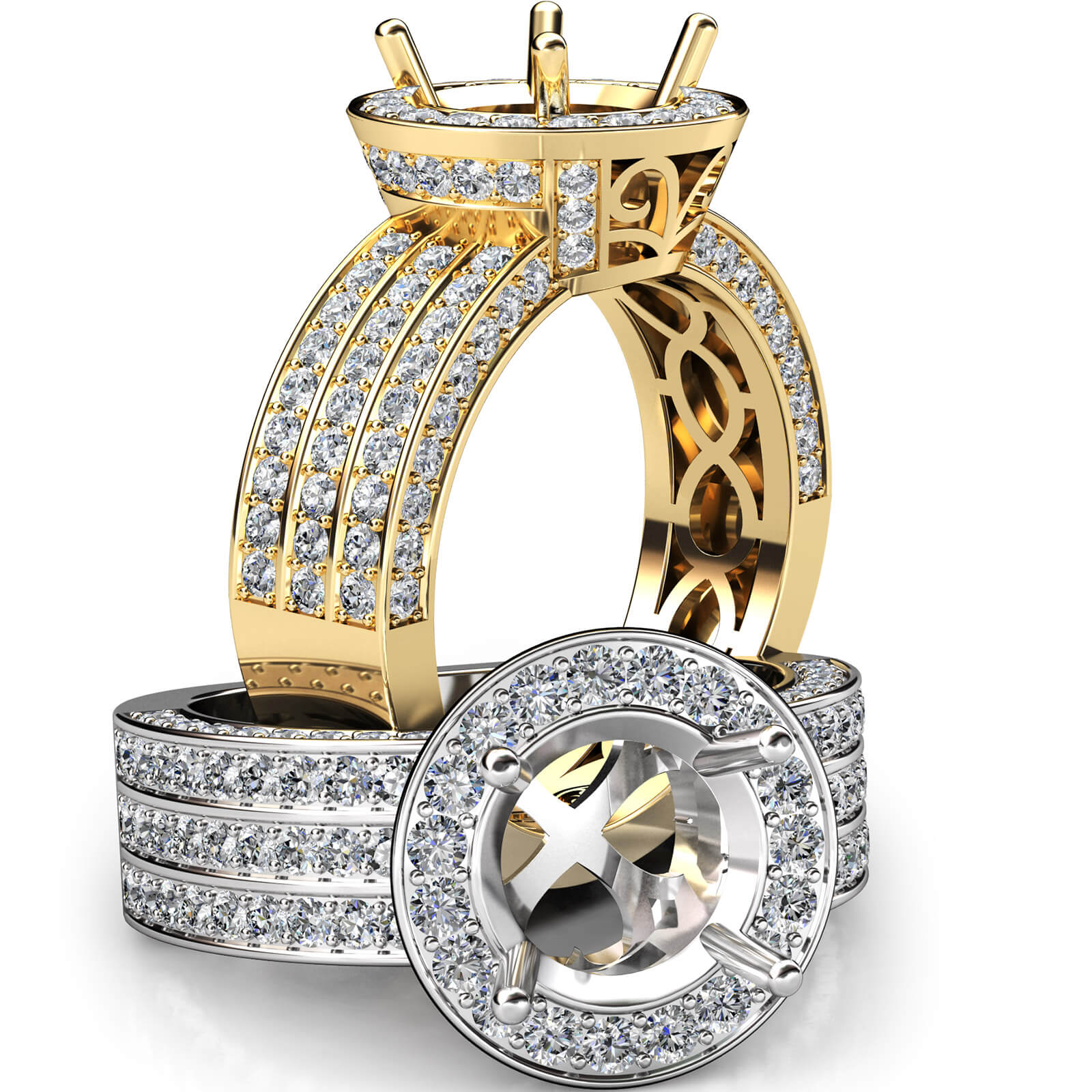 Halo Setting 3 Row Diamond Engagement Round SemiMount Ring 18k Gold (1.35Ct. tw.)