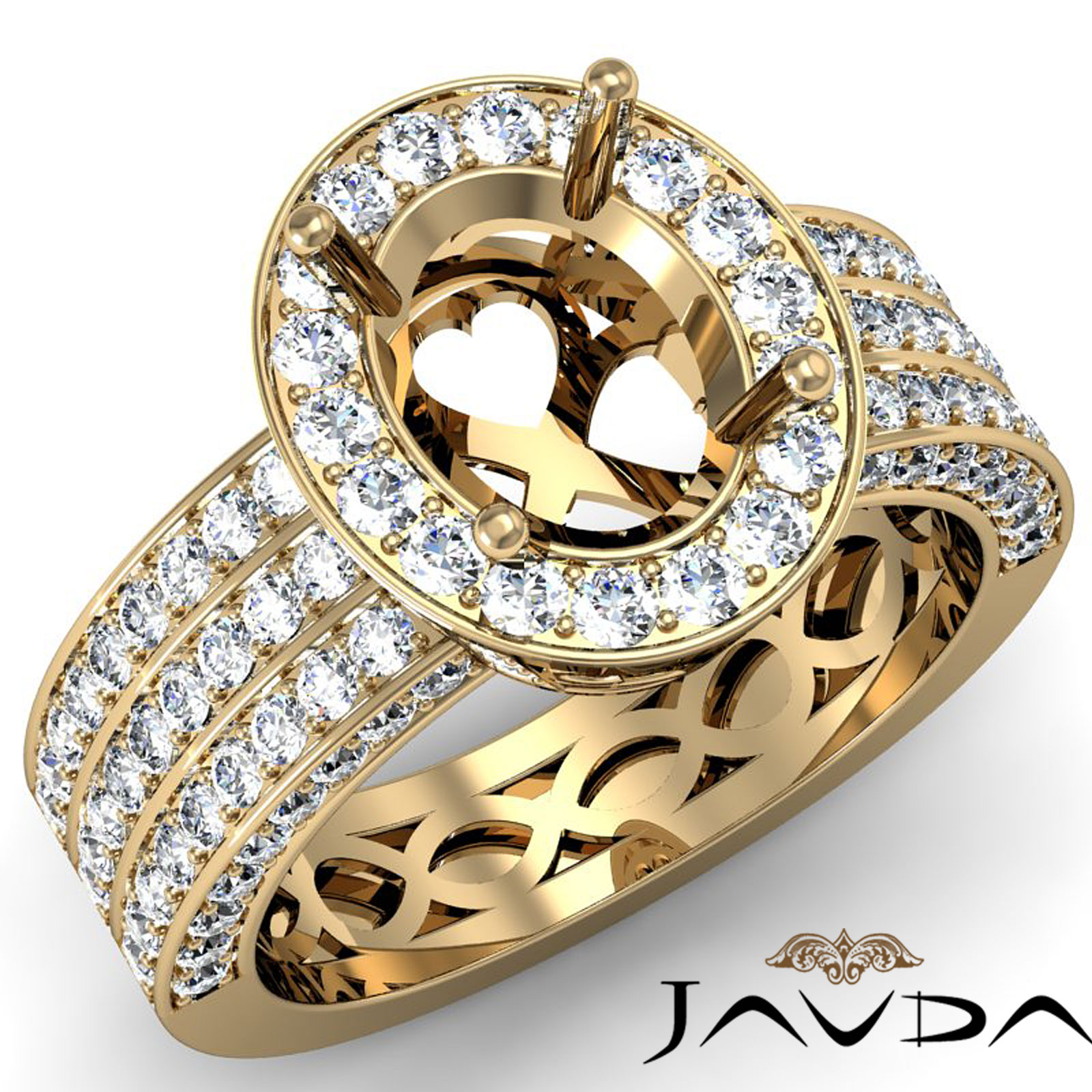 Bring brilliance to life?s great moments, with this oval semi mount diamond engagement ring, Made in 18k Gold Yellow, it features of pave set round diamonds in halo & the shank. (1.45Ct. tw.)
