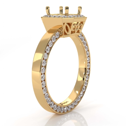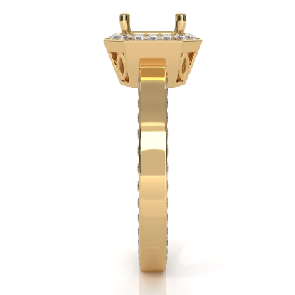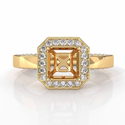 Lavishly romantic, this asscher semi mount diamond engagement ring is made in enduring 14k Gold Yellow. It showcases of round pave set diamonds sparkling in halo & along the shank. (1.42Ct. tw.)