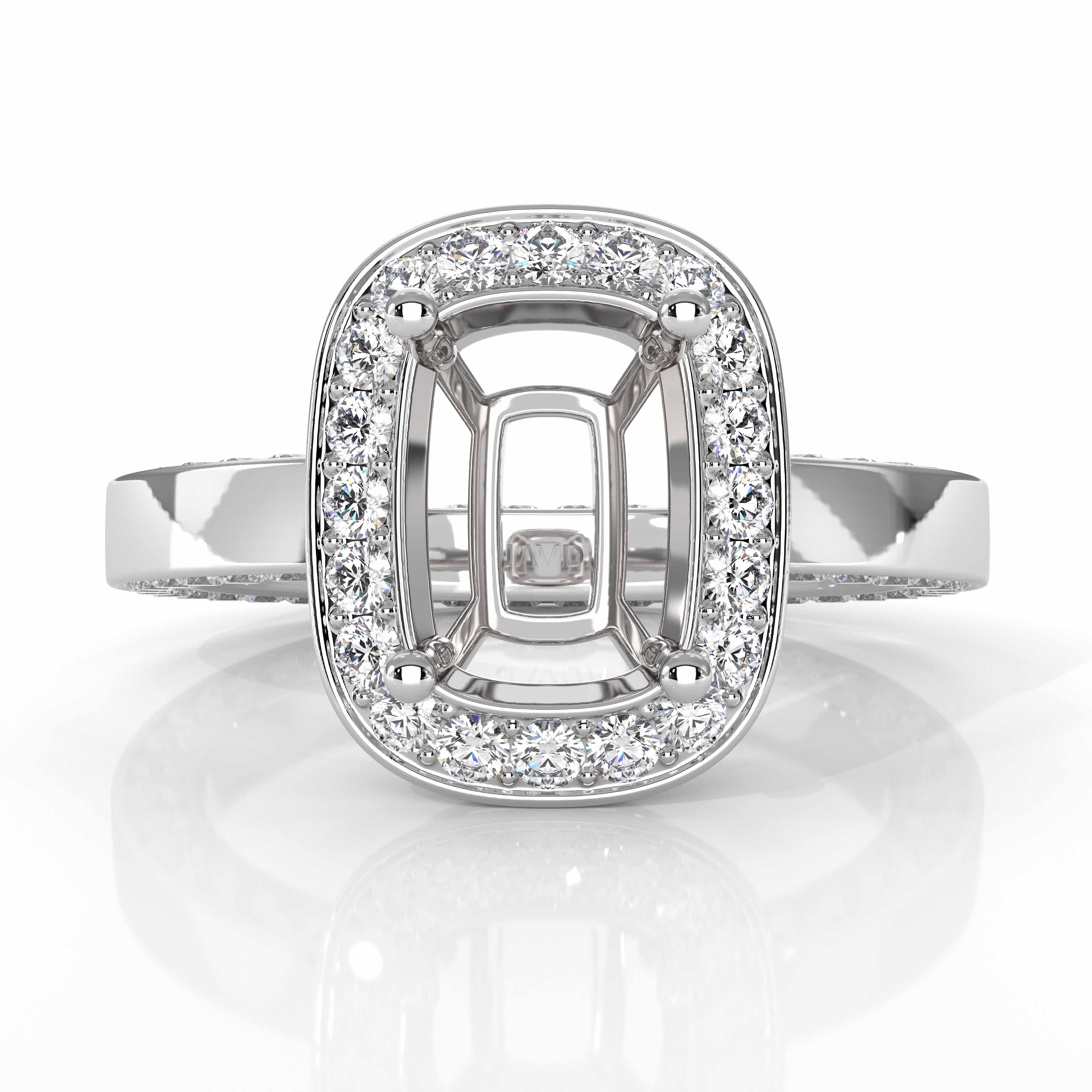 Undeniably striking, this cushion semi mount diamond engagement ring is made in lustrous 18k Gold White. It features of round pave set diamonds in halo & along the shank. (1.38Ct. tw.)
