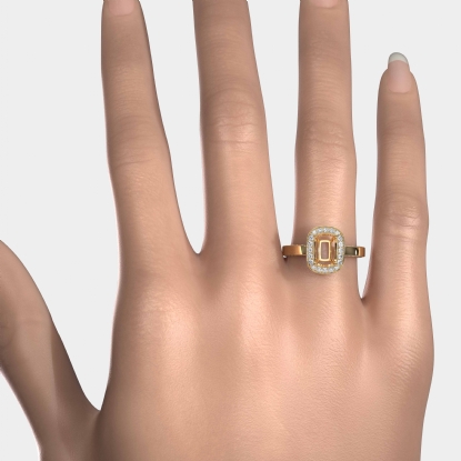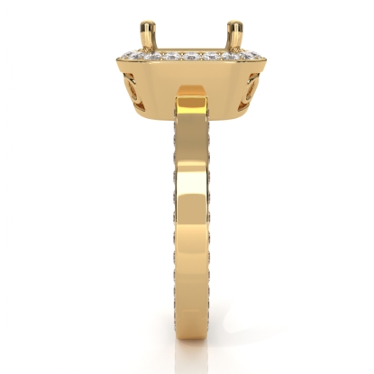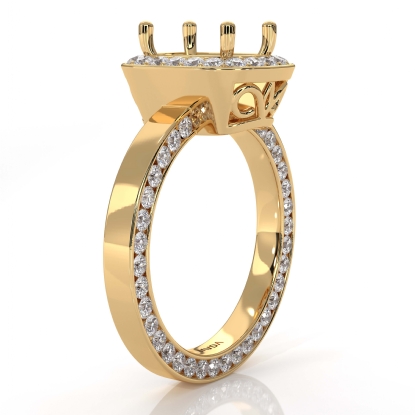 Undeniably striking, this cushion semi mount diamond engagement ring is made in lustrous 18k Gold Yellow. It features of round pave set diamonds in halo & along the shank. (1.38Ct. tw.)