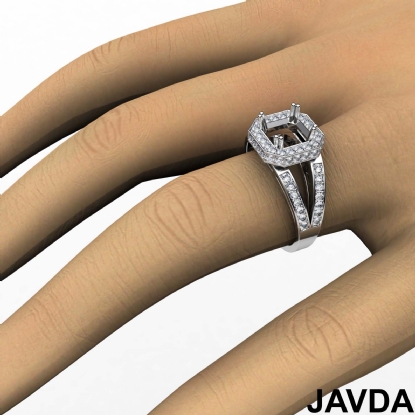 Lavishly showcasing your center semi mount with brilliance, this ring is made in Platinum 950 & features an asscher semi mount halo & split shank in pave set round diamonds totalling (0.63Ct. tw.)