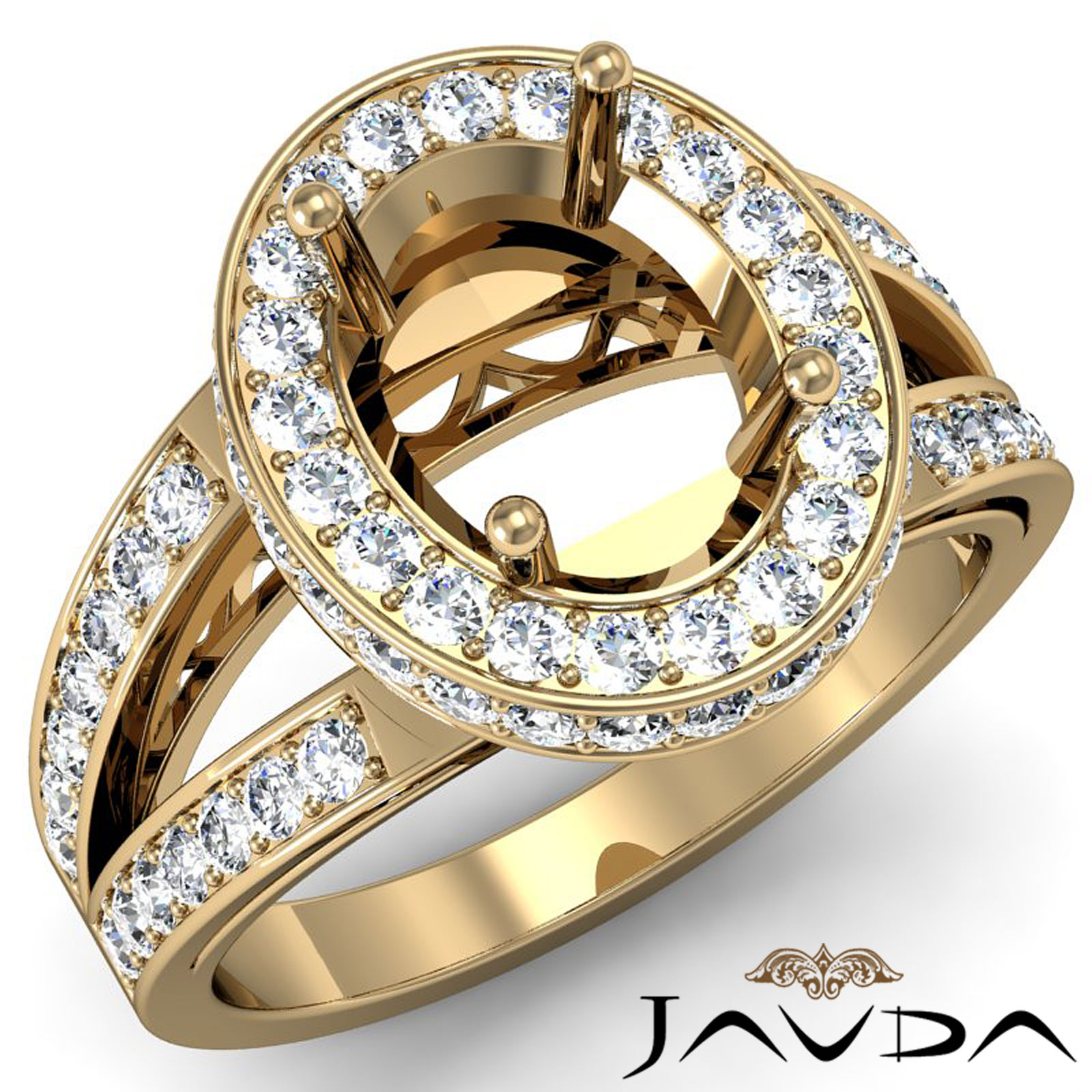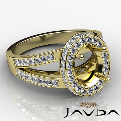 Lavishly romantic, this semi mount diamond engagement ring is made in 14k Gold Yellow. It features of round diamonds in pave setting on halo and on the split shank. (0.74Ct. tw.)