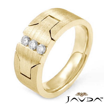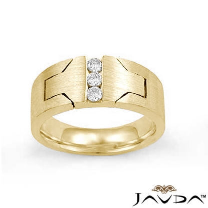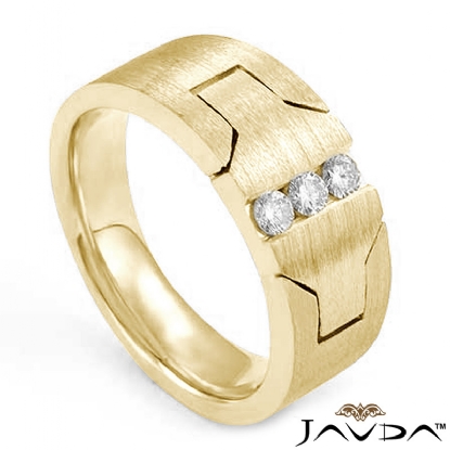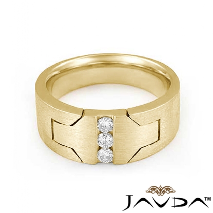 Unique design 3 stone matte finish men's diamond half wedding band is made from precious 14k Gold Yellow. Featuring matte finished band with unique cuts and round diamonds set in a channel setting.